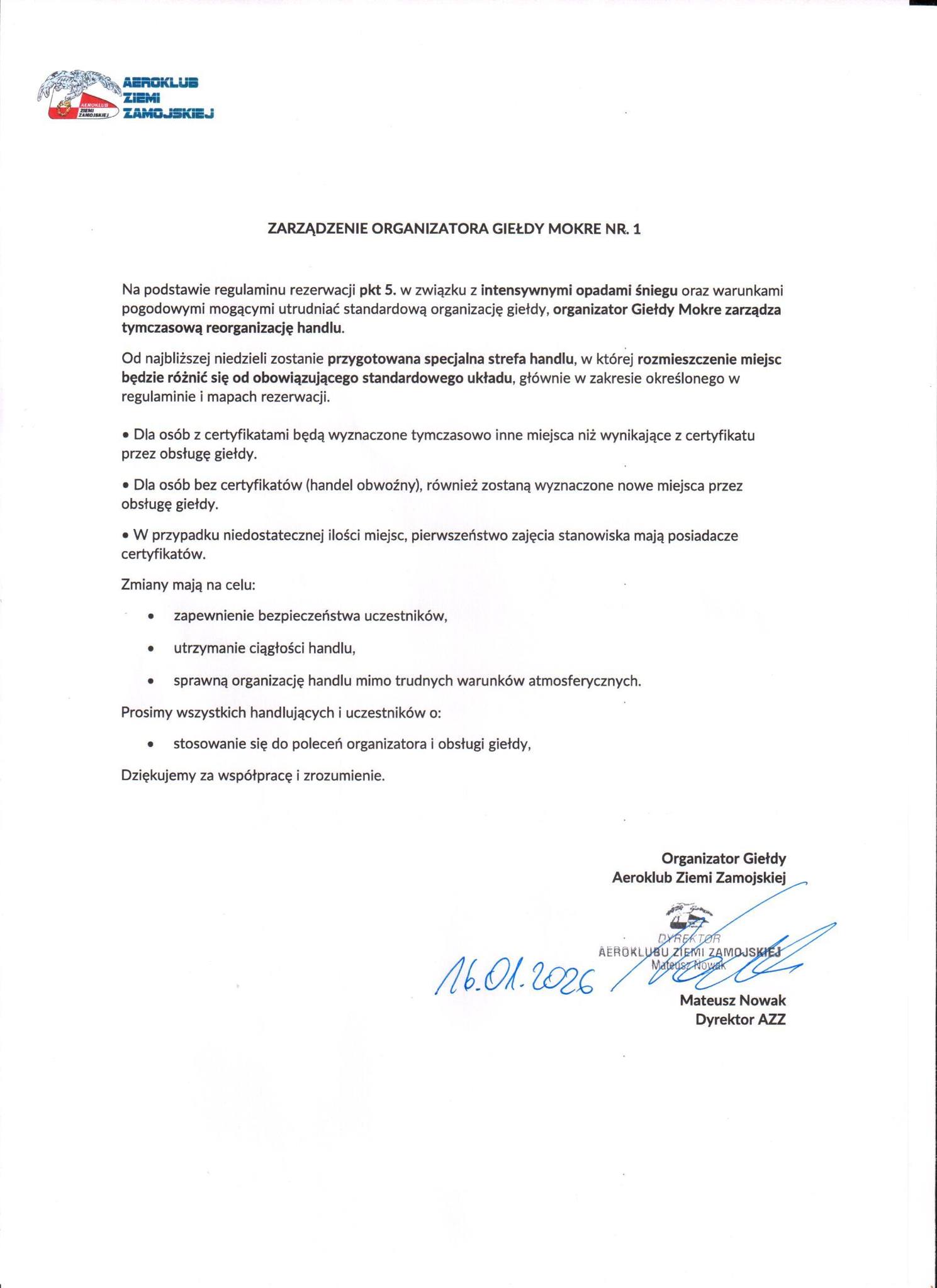 UWAGA – ZARZĄDZENIE ORGANIZATORA GIEŁDY MOKRE NR.1